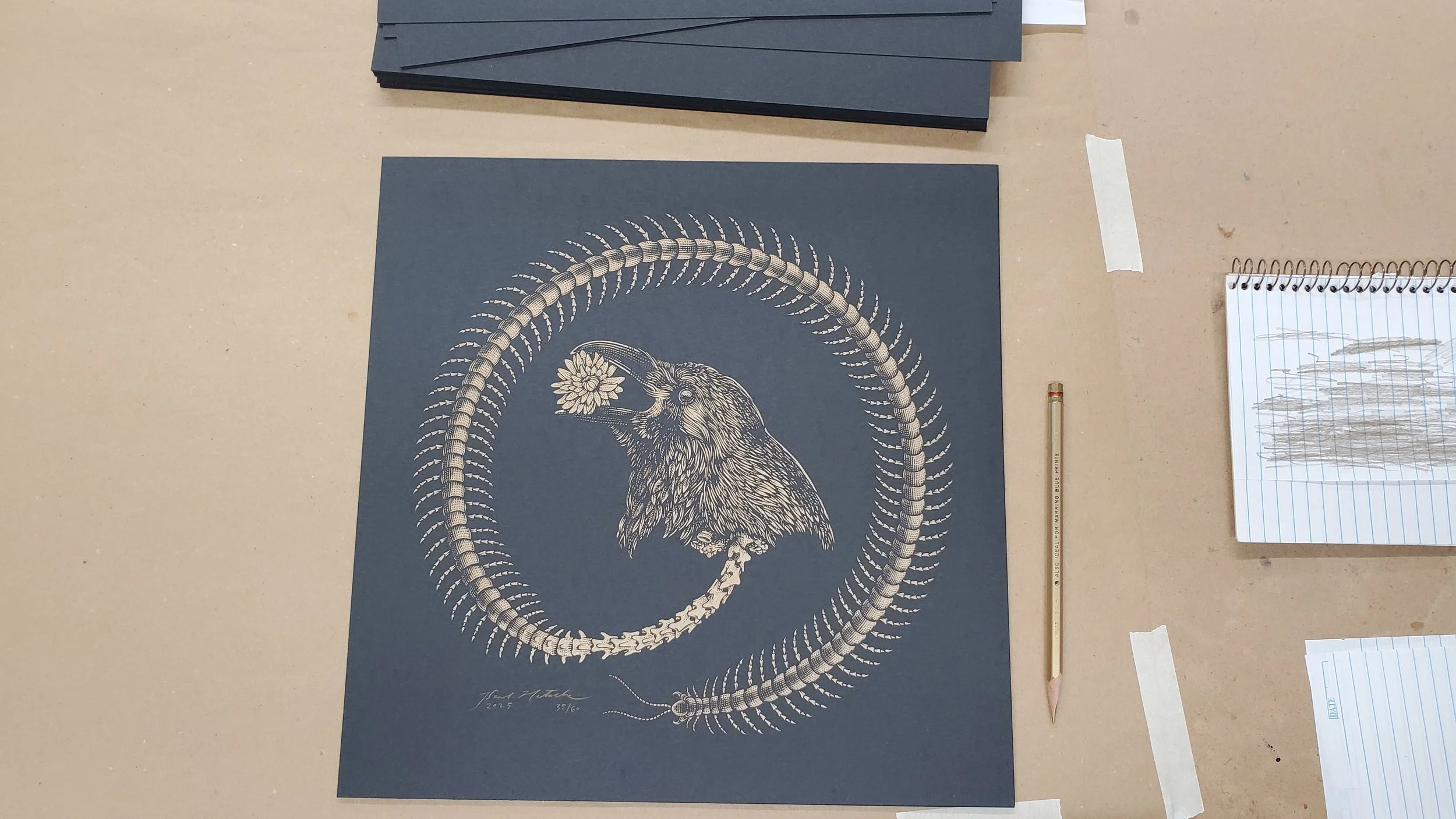 To celebrate the release of Pygmy Lush’s TOTEM album, I am offering a small edition of tintypes of my sculpture used for the album cover. Ten Totem I tintypes were made by me, using photographic processes developed in the 1850s. The tintypes measure 7.5 x 7.5 inches and vary slightly in tone and contrast, due to them being all made individually by hand. A signed and numbered 3.5x5” black card stock letterpress certificate, designed and illustrated by me and printed in silver ink by Flying Rabbit Press, is also included. This tintype is a slightly different version than the tintype I created for the album cover, having filled in the spaces above and below the raven where the cover typography went. The tintype was created using my 1903 Century No. 2 camera with a 1900 Dallmeyer 3A lens.